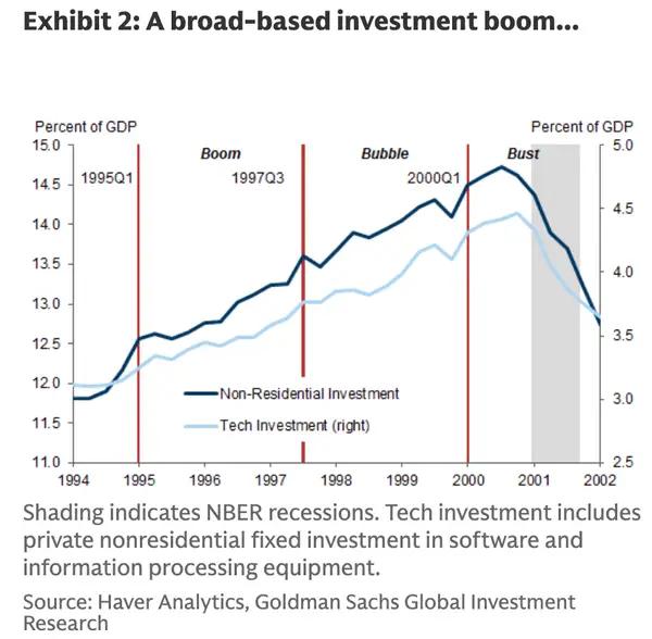 根据高盛的分析,在互联网泡沫破裂前的几个月里,投资支出开始大幅下降。