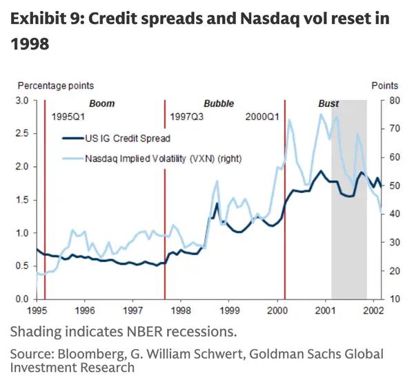 高盛指出,在互联网泡沫破裂之前,信贷利差已经扩大。通常而言,信贷利差会在投资者认为风险较高并要求获得更高回报时扩大。