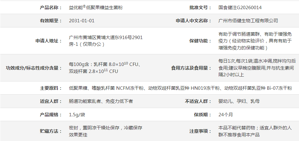 汤臣倍健旗下子公司佰健生物申报的“益优能®低聚果糖益生菌粉”获批两项功能:“有助于调节肠道菌群”和“有助于增强免疫力”。“益优能”作为新出现的品牌标识,尚无更多公开信息,值得关注企业是否正尝试在微生态等功能细分领域建立更清晰的产品区隔。