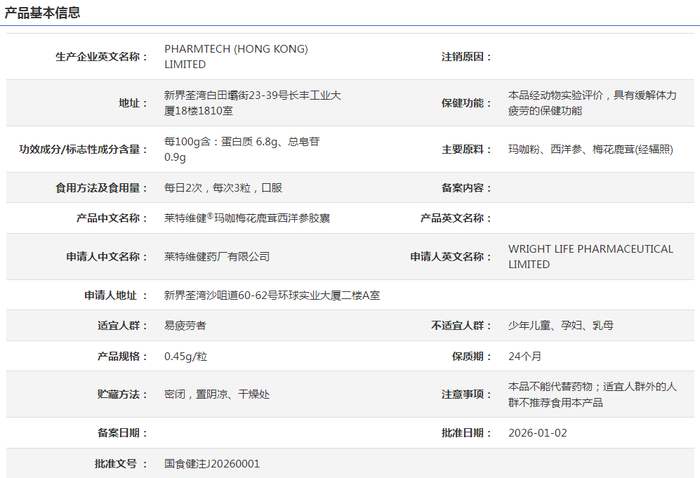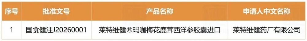 作为2026年的1号进口“蓝帽子”,莱特维健本次获批的玛咖梅花鹿茸西洋参胶囊,保健功能为“缓解体力疲劳”。企业在打通了现场核查的“关节”后,后续注册产品注册流畅度大幅提升。